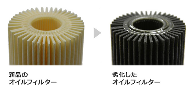 オイルフィルターは劣化すると、右の写真のように黒ずみます。フィルターが目詰まりした状態ではオイルの汚れの除去ができなくなります。