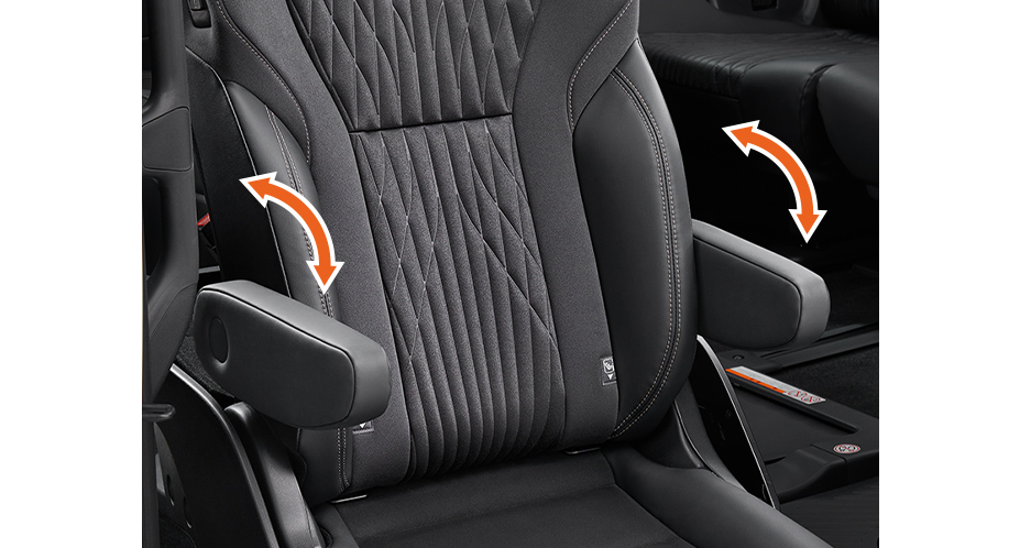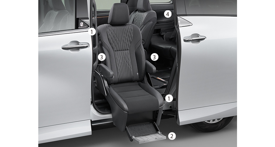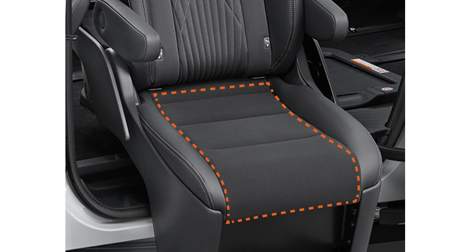 セカンドシートが回転して、車外へスライドダウン&チルト。立ち上がりや着座をやさしくサポートします。