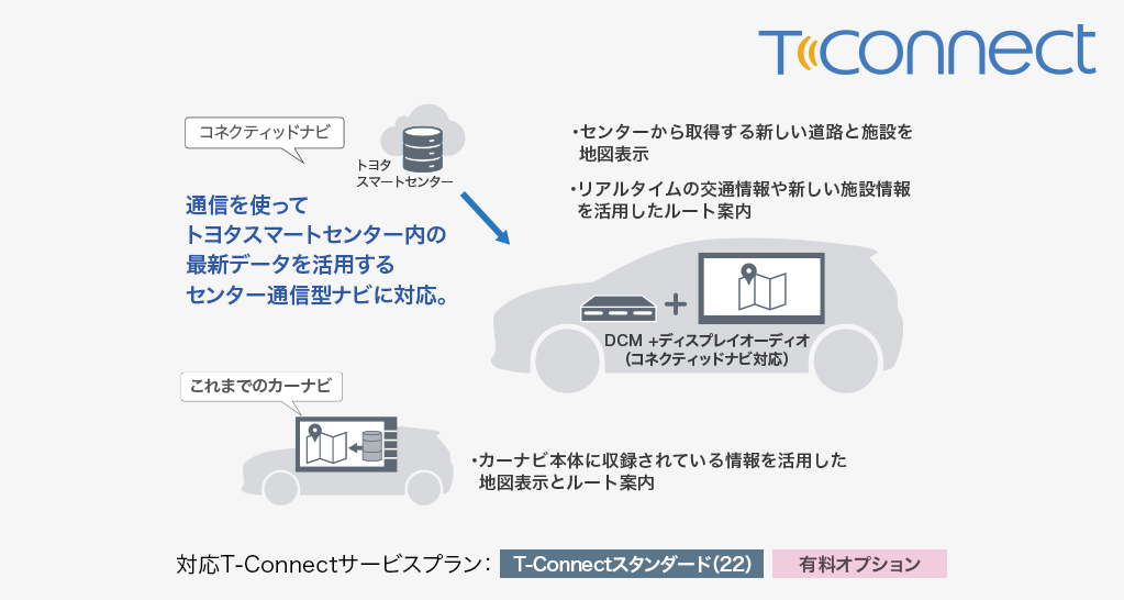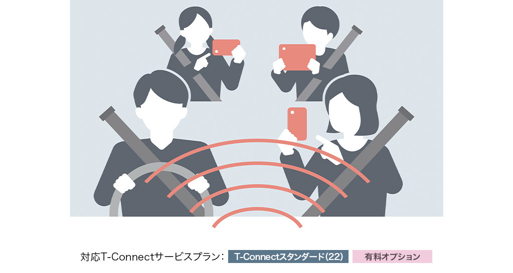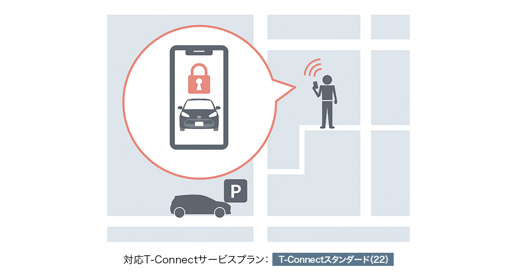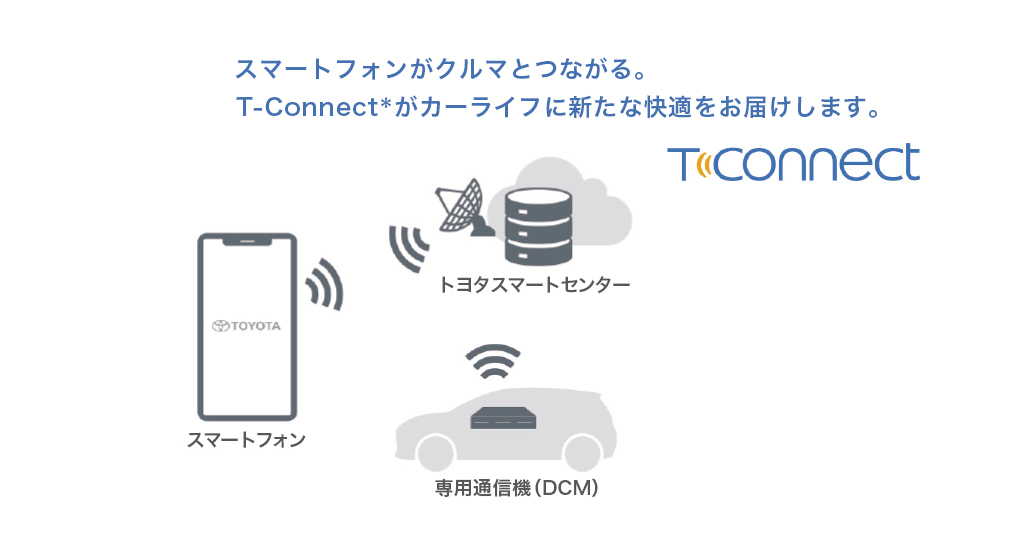 クルマがセンターとつながり、安心・安全・快適なカーライフをご提供するT-Connect。クルマのご利用はもちろん、離れた場所からスマートフォンを使ってクルマの状態を確認、操作できるリモートサービスに加え、新たなコネクティッドサービスでもっと快適なカーライフをお届けします。