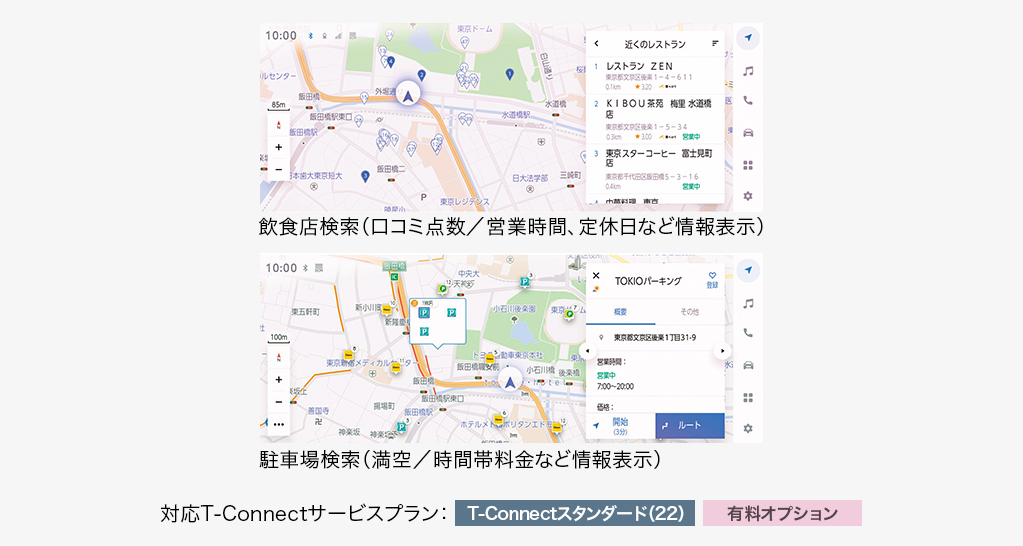 T-Connectの契約でセンター通信型のナビゲーション「コネクティッドナビ」が5年間無料*2でご利用いただけます。既に収録されているナビ情報を活用するこれまでのカーナビとは異なり、通信によってセンターから取得する新しい情報(地図・施設・交通情報)を活用した目的地検索・ルート設定が可能*3です。また、オンラインによるリアルタイムかつ豊富な情報を活用することができます。例えば、飲食店検索では口コミ点数を検索結果の一覧や地図上に表示、施設情報ではその店の営業時間や定休日を確認することができます。また、駐車場検索では、駐車料金や空き状況を地図上に表示するなど、目的地の選択に役立つ幅広い情報をご提供します。