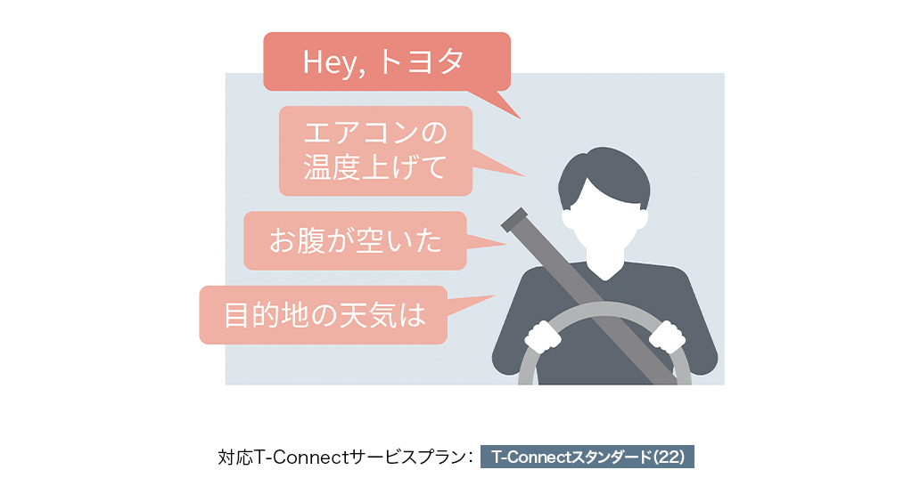 スイッチ操作は不要、あなたの声にクルマが応えます。「Hey,トヨタ」と話しかけるだけで、エージェントが起動して目的地検索や天気予報などの情報をご提供します。また、エアコンの温度調整や窓の開閉など、車両の操作も可能。声によるさまざまなご要望にエージェントがお応えします。