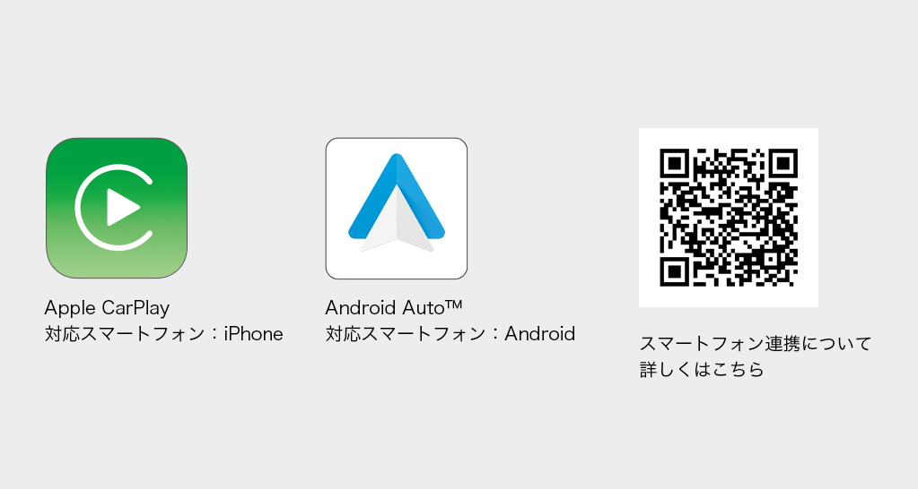 スマートフォンをUSBケーブルで接続*2(Apple CarPlayはワイヤレスにも対応*4)するとディスプレイに操作可能なスマートフォンアプリが表示されます。音楽やマップ、電話やメッセージなど、使い慣れたスマートフォンアプリを大画面のディスプレイで操作、ご利用いただけます。