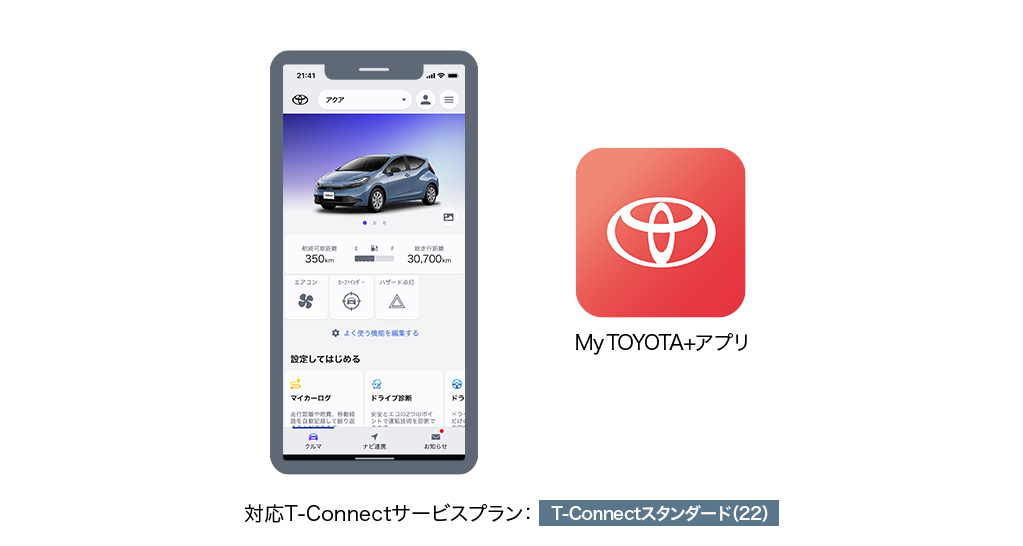 専用スマートフォンアプリ「My TOYOTA+」を使ってT-Connect*2のサービスがご利用いただけます。
