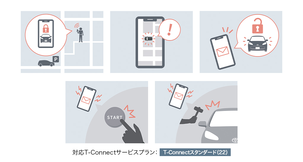 ドアロックの施錠忘れやハザードランプの消し忘れなど、離れた場所から「My TOYOTA+」で確認、操作が可能です。また、ドアのこじ開けなどオートアラームの作動やクルマの始動を検知すると「My TOYOTA+」やメール*にすみやかにお知らせします。