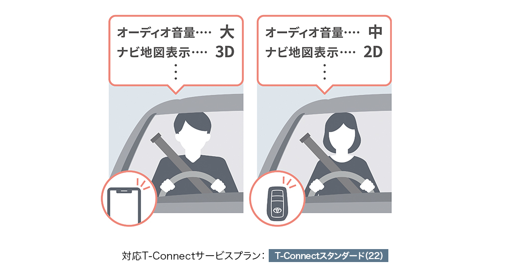 ご家族でクルマをシェアする時など、個々のよく使うオーディオやナビの地図表示など運転する方のお好みの車両設定を記録。乗車の際、事前に登録したスマートキーやスマートフォン*2で運転者を認識し、ドライバーそれぞれの最適な車内環境に自動で設定します。