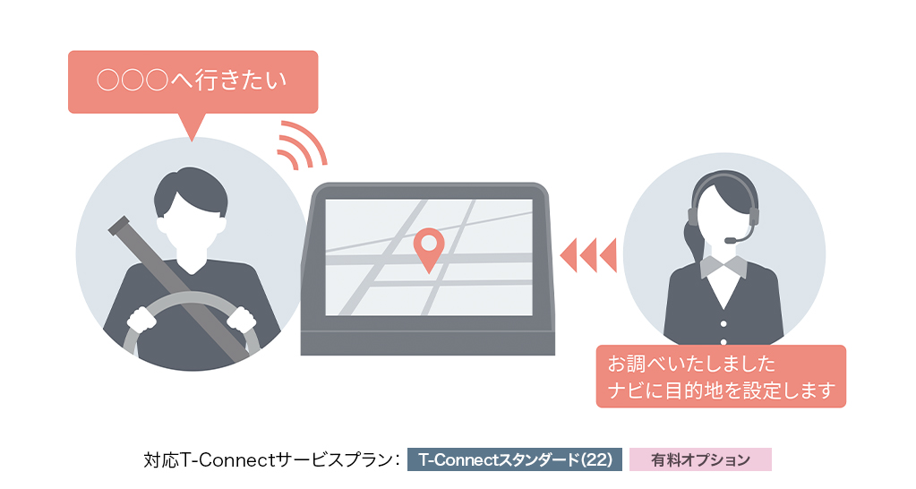行きたい場所や知りたい情報を伝えるだけで、オペレーターがお客様に代わって検索し、ナビの目的地設定も行います。人ならではのきめ細かく柔軟な対応でご希望に沿ったサポート*2をいたします。