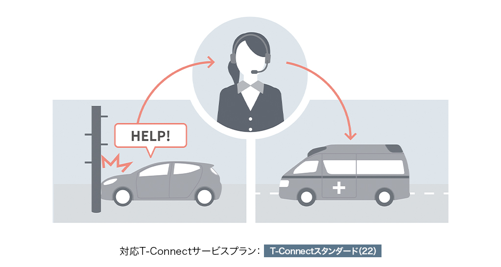 急な体調不良時も、ヘルプネットボタンを押すだけでヘルプネットセンターのオペレーターにつながります。今いる場所がどこか分からなくても、車両位置情報に基づいて迅速に緊急車両を手配。さらに、あおり運転などのトラブルの時にも状況に応じて警察へ通報します。また、エアバッグ作動時には自動でオペレーターに接続。ドクターヘリ等の早期出動判断*2を行うD-Call Net®にも対応しています。