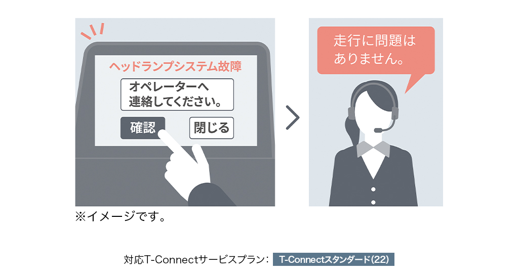 警告灯が点灯した場合、ディスプレイ画面よりeケアコールセンターに接続が可能です。このまま走行を続けられるか不安な状況に、車両情報をもとにeケアコールセンターが24時間365日、適切な対処方法をアドバイスいたします。また応対内容は、あらかじめ登録しているトヨタ販売店(リモートメンテナンス店)にも連携され、点検や修理などをご案内させていただく場合があります。*4