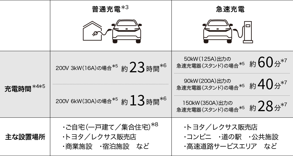 ご家庭では、付属の充電ケーブル*1とコンセントをつなぐだけで手軽に充電可能。道の駅やサービスエリアなどに設置されている「急速充電」にも対応しているので、外出先でも気軽に充電できます。