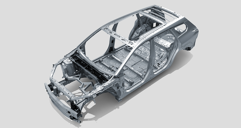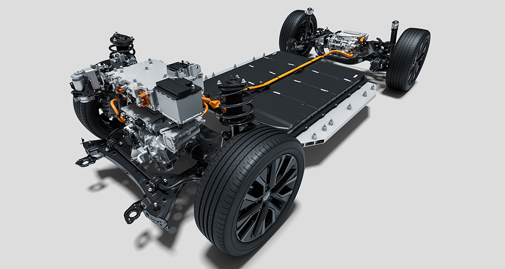 電池パックと車体フレームを一体化させることでボディ剛性を向上。また、主要骨格部位に高強度と軽量化を両立する部材(ホットスタンプ材、高張力鋼板など)を最適配置。トランスアクスルやモーター、インバーターを一体化したeAxleの採用も、ボディの軽量化につながっています。