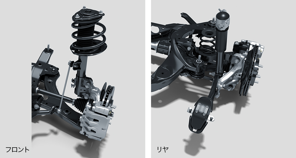 サスペンションは、ばね定数やアブソーバーの減衰力の調整により、優れた乗り心地と操縦安定性を高次元で両立。さらに構造材の接合には、ブルブルとした不快な振動を抑える効果が大きい高減衰タイプの接着剤を使用。どのような路面状況においてもフラットな乗り心地を実現しています。