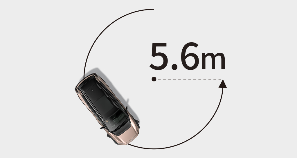 ロングホイールベースでありながら、最小回転半径は5.6m。細い路地に入るときやUターン時、車庫入れや縦列駐車の取り回しがスムーズに行えます。