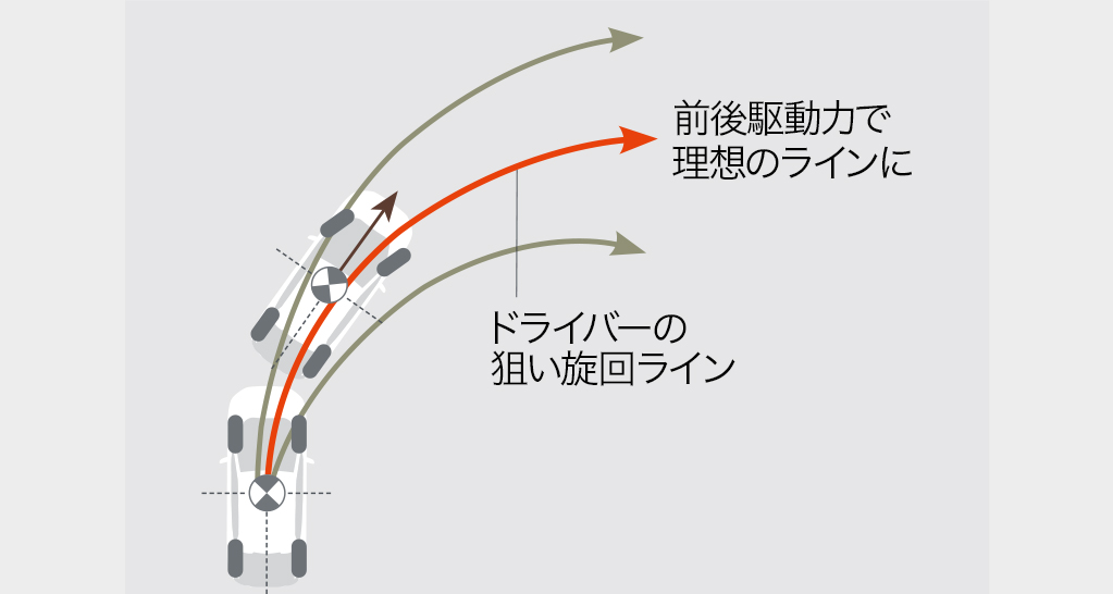 フロント左右輪の回転差を、前後駆動力配分にフィードバック。これによりライントレース性が向上し、ドライバーの狙いどおりの安定したコーナリングを実現。特に高速コーナーでの安心感が高まりました。
