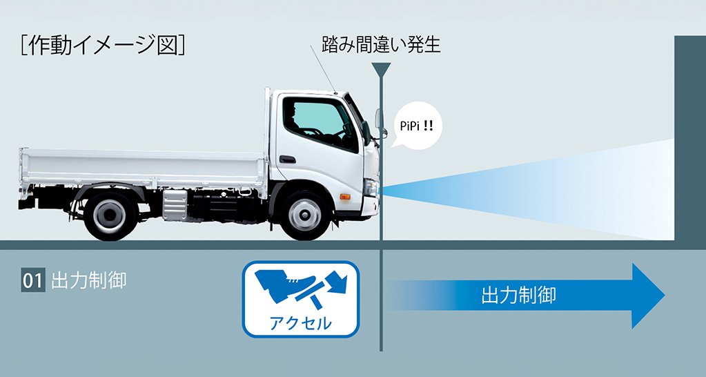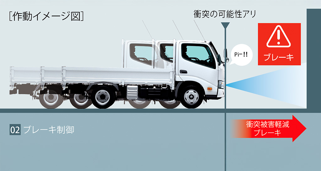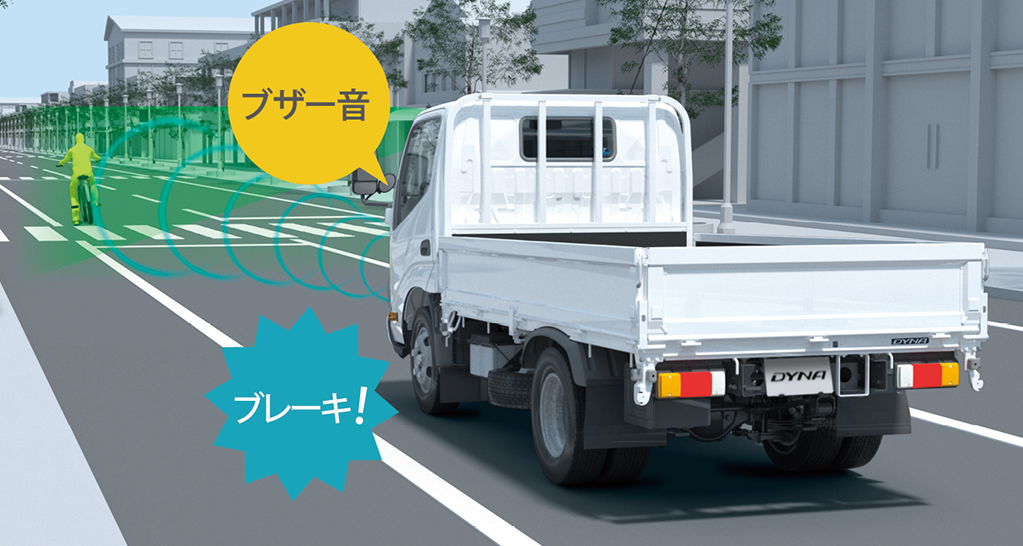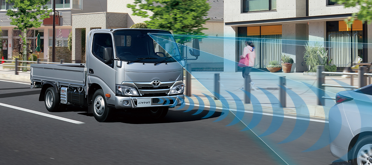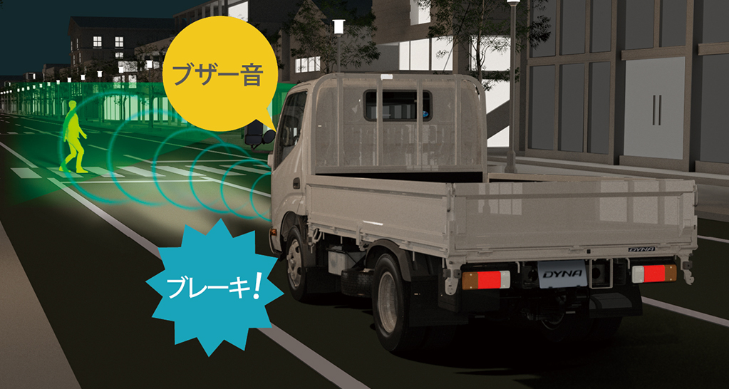停車中にブレーキが緩んで車が動き出しても、前方の障害物を検知するとドライバーに注意を喚起。さらに距離が縮まるとエンジンの出力制御とブレーキ制御により衝突回避を支援します。