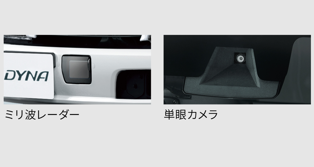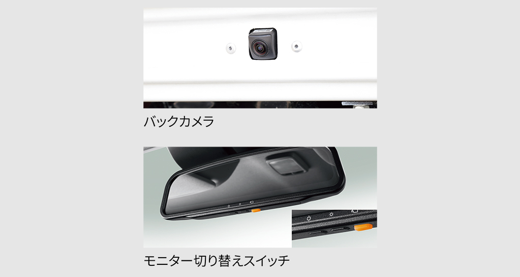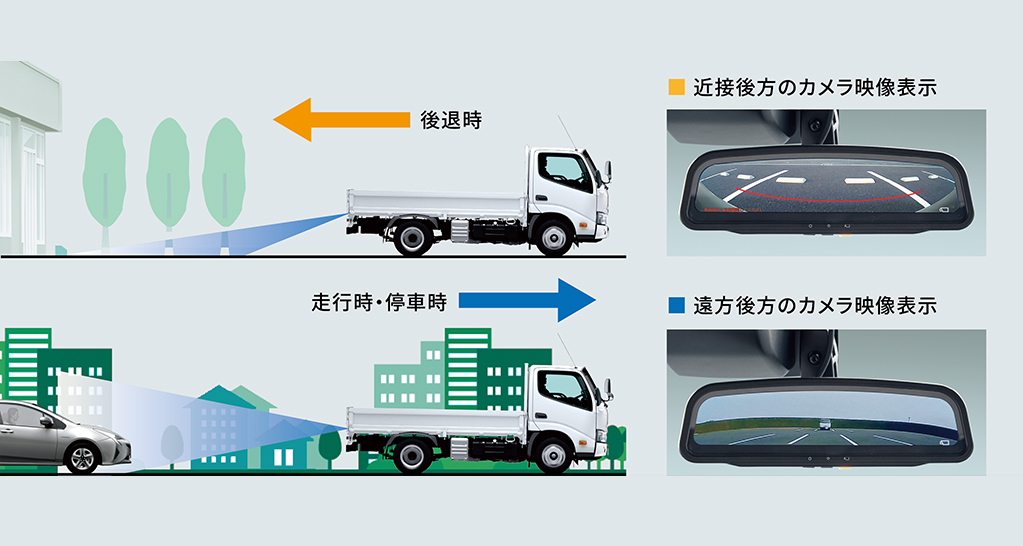 積荷時などに目視しにくい後方視界を確認するため、バックカメラの映像をモニター搭載のインナーミラーに映し出すシステム。ミラーの電源をONにすると後退時に「近接後方」が表示され、その状態からモニター切り替えスイッチを押すと走行時・停車時に「遠方後方」が表示されるようになります。また、ミラーの電源がOFFの場合も、後退時にはミラー左上画面に車両後方映像が表示され、後退操作の補助として役立ちます。