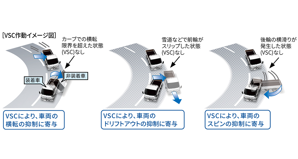 VSCは、滑りやすい路面などで車両の横滑りをセンサーが感知し、各輪のブレーキとエンジン出力を制御することで車両の安定性を確保します。TRCは、滑りやすい路面での発進・加速時に駆動輪の空転を抑え適切な駆動力を確保して加速中の直進性、車両安定性をサポートします。