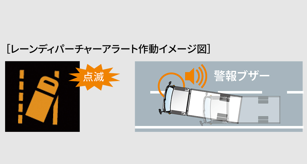 道路上の白線(黄線)を単眼カメラで認識。ドライバーがウインカー操作を行わずに車線を逸脱した場合、マルチインフォメーションディスプレイの“車線注意”表示と警告ランプの点滅、ブザーによる警報で注意を喚起します。