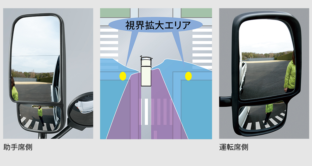 車両側面の視界エリアを大幅に拡大した2面鏡式ミラー。右・左折時の歩行者等の早期発見により、巻き込み事故防止などに効果を発揮します。また、助手席側にはワイドビュー2面鏡式ミラーを採用。上側の視界が広く確保されるため、高い荷台を搭載している車両にも安心です。