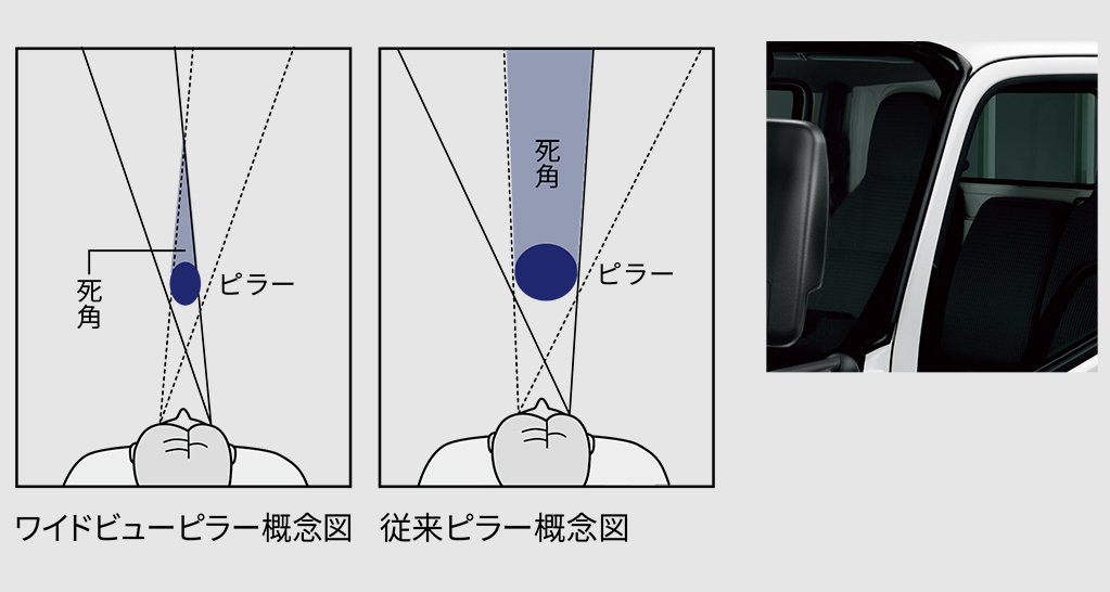 ピラーがあることにより、右目と左目に見えない範囲が生じます。ワイドビューピラーでは左右両視線で見ることにより、従来に比べ死角が少なくなり、運転席からのより確かな視界が確保できます。