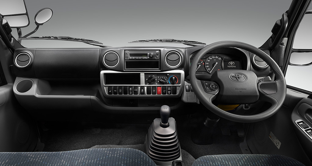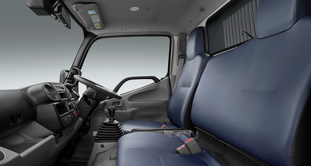 写真は10尺デッキ・2WD・フルジャストロー・2.0トン積の室内。ボディカラーはホワイト〈058〉。“Gパッケージ”装着車。プリントトリコットのシート表皮はメーカーオプション。助手席SRSエアバッグ、助手席プリテンショナー機構付シートベルト、助手席シートベルト非着用警告灯、助手席アシストグリップ(2個)はセットでメーカーオプション。