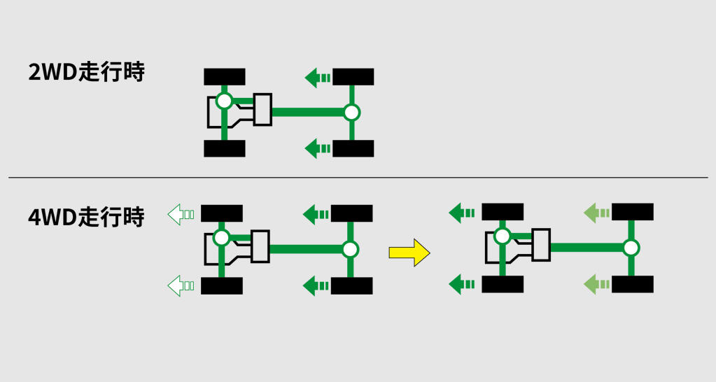 通常の路面状況では、前輪に駆動力が伝わらない2WD(FR)走行状態です。