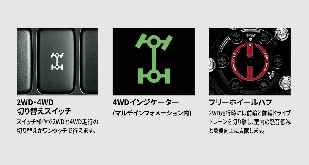 低燃費とスムーズな発進・加速をもたらす6速AT。シーケンシャルシフトの採用によりドライバビリティが向上。シフトレバーを小型化することで、室内の移動性と操作性を両立しています。また、燃費性能に優れるほか、全域にわたって思いのままにパワーを操ることができる6速(2WD車)・5速(4WD車)のマニュアルトランスミッションを設定しています。
