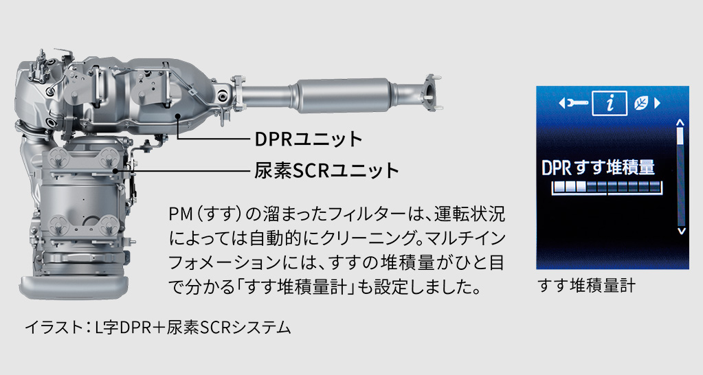 DPR※1+尿素SCR※2システムを採用し、平成28年(ポスト・ポスト新長期)排出ガス規制をクリア。