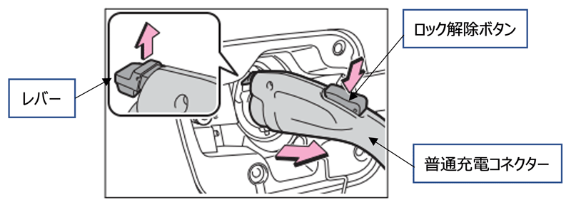 | アンロックする方法 | ドアを解錠すると、普通充電コネクターがアンロックされます。 ロック解除ボタンを押して、レバーが上がることを確認してから普通充電コネクターを手前に引いてください。 |