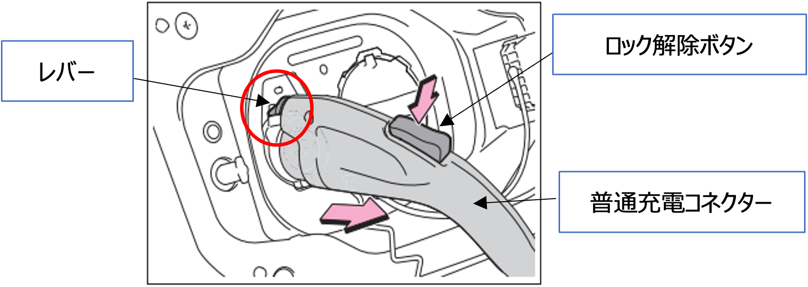 | アンロックする方法 | ドアを解錠すると、普通充電コネクターがアンロックされます。 ロック解除ボタンを押して、レバーが上がることを確認してから普通充電コネクターを手前に引いてください。 |