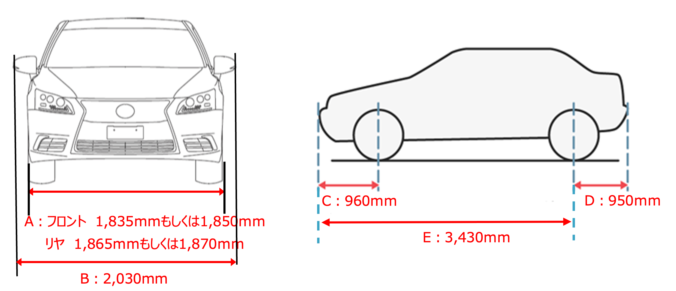 | F値(フロントバンパーオーバーハング+ホイールベース)※2 | E | 3,430 | ||
