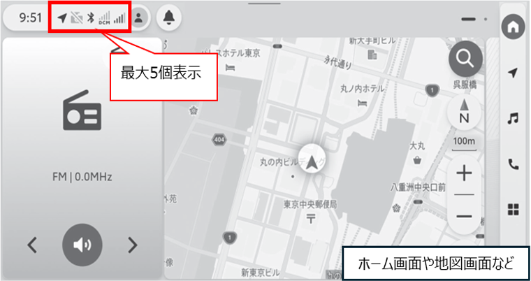 画面上部のステータスバーには、優先度の高いステータスアイコンが最大5個表示される仕様です。