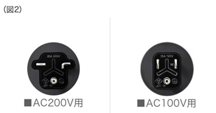 AC200V仕様をAC100V仕様に変換するための電源プラグコード(図1)を標準装備設定しております。