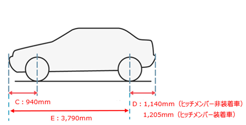 | リヤバンパーオーバーハング | D | ヒッチメンバー非装着車 | 1,140 | ||