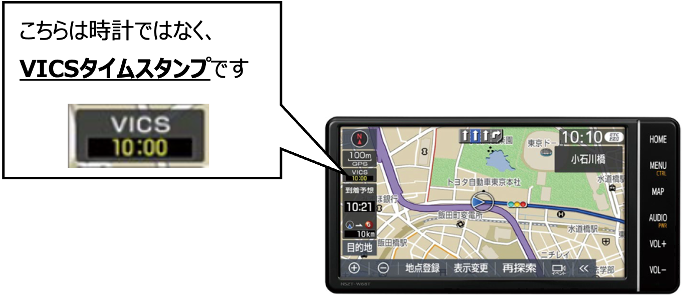 地図画面に表示されるVICSタイムスタンプの時刻は、時計ではございません。