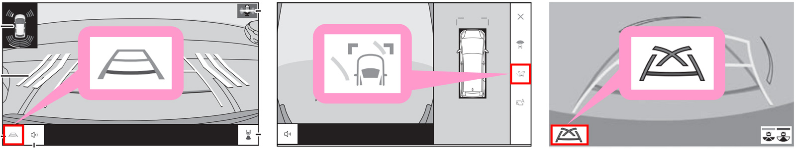 シフトポジションをRにし、バックモニターを表示した状態で、下図のボタンを操作してガイド線が表示されるかご確認ください。