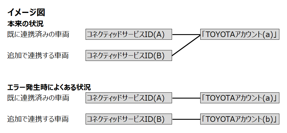 追加で登録されようとした車両のT-Connect ID/レクサスオーナーズカードID/G-Link Lite ID(図(B))が、既に別の「TOYOTAアカウント」(図(b))と連携されている可能性が高いです。