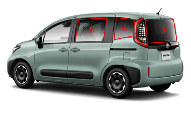 | バック | ドアガラス | 全車に標準 | UVカット機能付プライバシーガラス | ⑥ | 濃色グレー | 90以上 |
