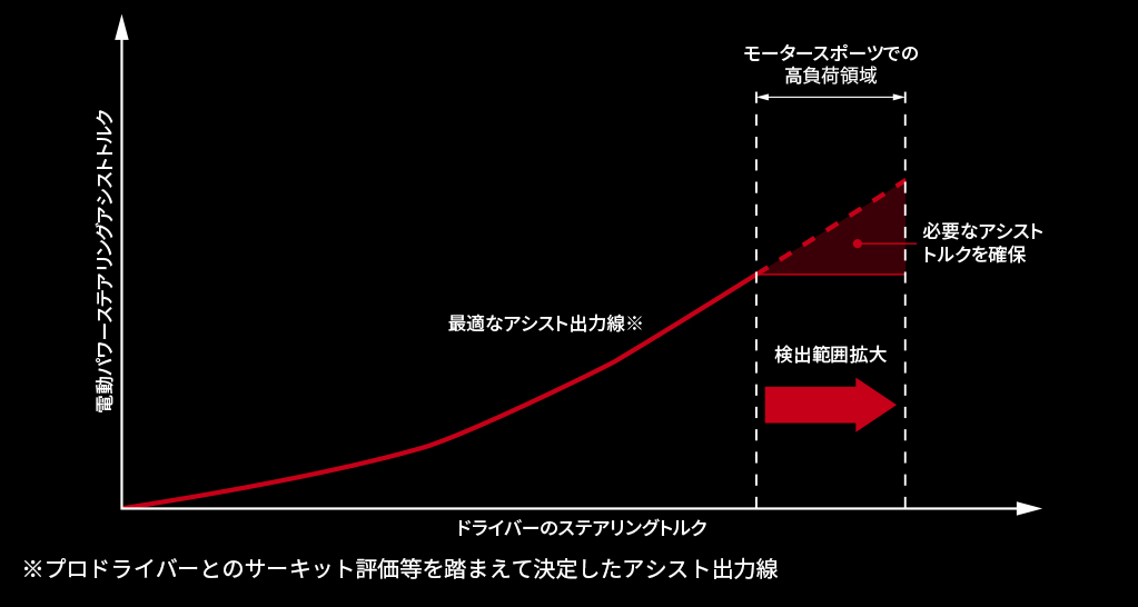 スーパー耐久シリーズや全日本ラリー選手権などで、ハイグリップタイヤに履き替えたことで、高負荷での旋回時に一瞬ステアリング操作が引っかかるという現象が発生していました。その改善のために、トルクセンサー内のトーションバー剛性を最適化し、ECU(電子制御ユニット)のプログラムもセットで変更することによって、ステアリングトルクの検出範囲を拡大。極めて高負荷での旋回時にも、最適なアシストを行い、スムーズなステアリング操作を実現しました。
