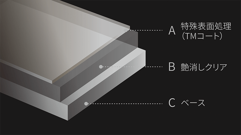 [TMコート]特別設定色マットメタル<1M1>の最表面には、マット塗装のお手入れを楽にする特殊表面処理[TMコート]を採用。匠の技術で、薄膜かつ均一に仕上げました。マットの外観に影響を与えることなく、持久力のある防汚性と汚れ除去性を実現しています。