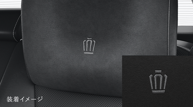 後席のヘッドレストに装着する脱着式のヘッドレストピローは、頭部から首周りを心地よく支えるクッション形状で快適さを追求。表面には高級感のあるスエード生地を採用し、王冠マークの刺繍をあしらっています。