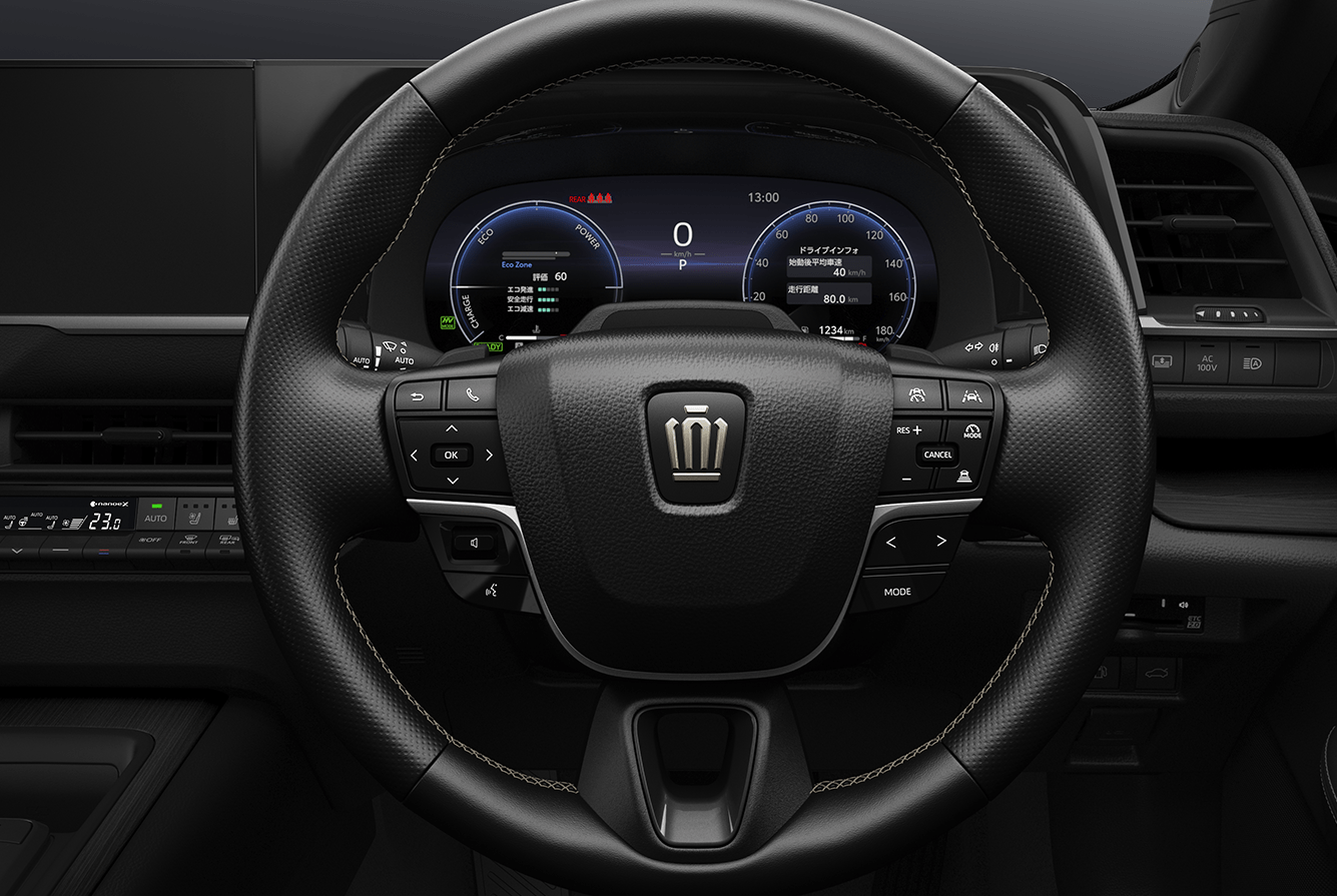 (ステアリングスイッチ周辺[シルバー]+スポーク[ダークグレーメタル]+ステッチ[グレー/かがり縫い]+ディンプル加工/ステアリングヒーター+タッチセンサー付)Photo:特別仕様車 Z ハイブリッド車 “THE LIMITED-MATTE METAL”(ベース車両はZ ハイブリッド車)。内装色は特別内装色ブラックラスター。 ■写真は機能説明のために各ランプを点灯したものです。実際の走行状態を示すものではありません。 ■画面はハメ込み合成です。