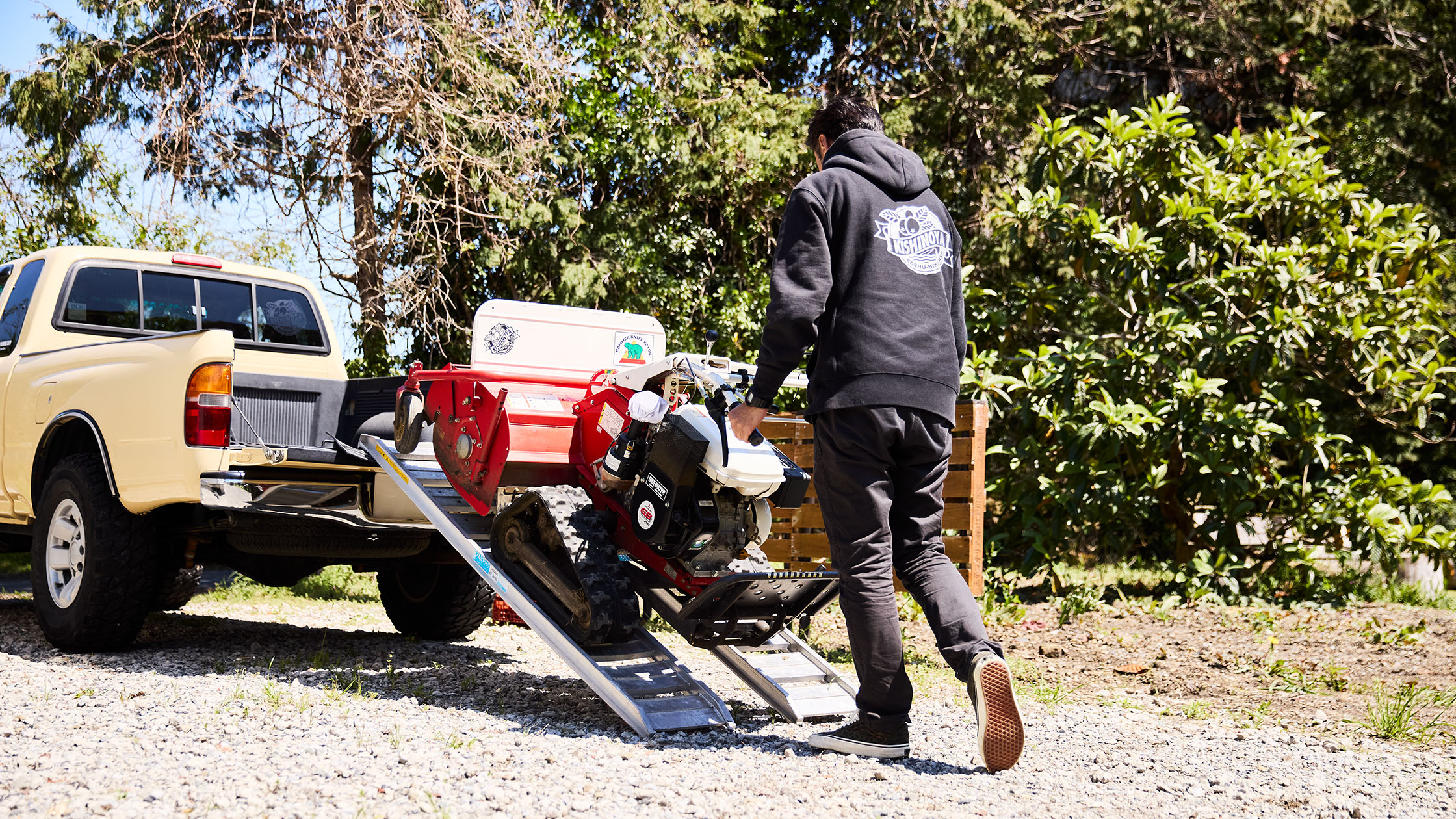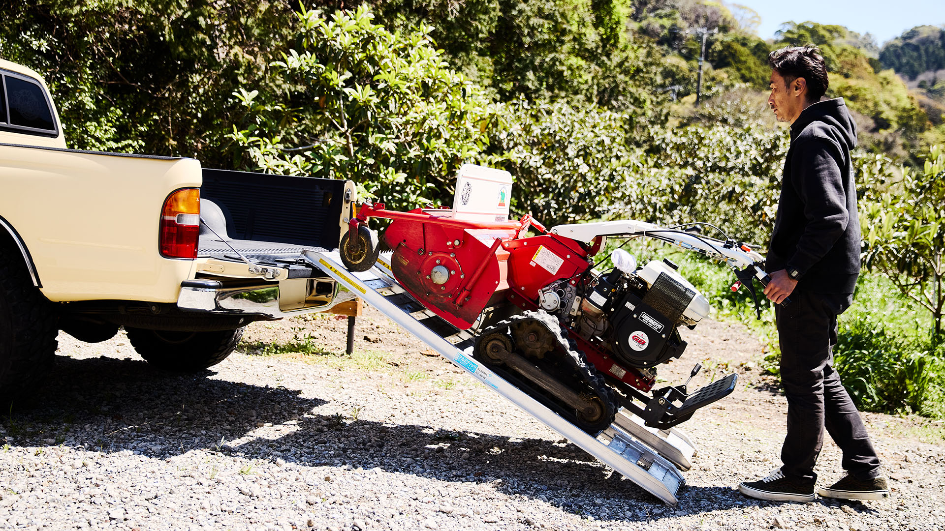 びわ栽培の仕事では、1t以上にもなる大量の肥料や草刈り機など、普段の軽トラでは載せきれないものを「タコマ」で運びます。また収穫の時期には遠方への配達にも使用しています。趣味でよくオフロードバイクに乗り林道を走るのですが、バイクを積載する際にも重宝しています。普段の買い物ではエクストラキャブの後席スペースを活用しており、雨の日でも荷物を濡らさずに運べるため、不便はありません。