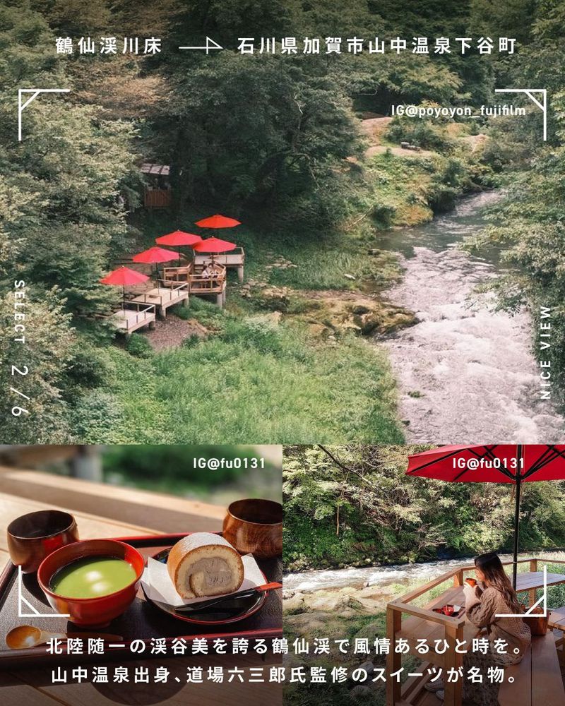 北陸随一の渓谷美を誇る鶴仙渓で風情あるひと時を。山中温泉出身、道場六三郎氏監修のスイーツが名物。
