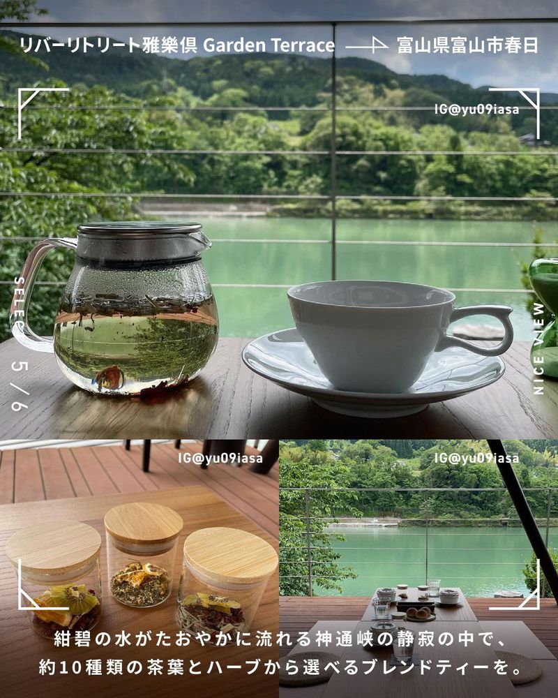 紺碧の水がたおやかに流れる神通峡の静寂の中で、約10種類の茶葉とハーブから選べるブレンドティーを。