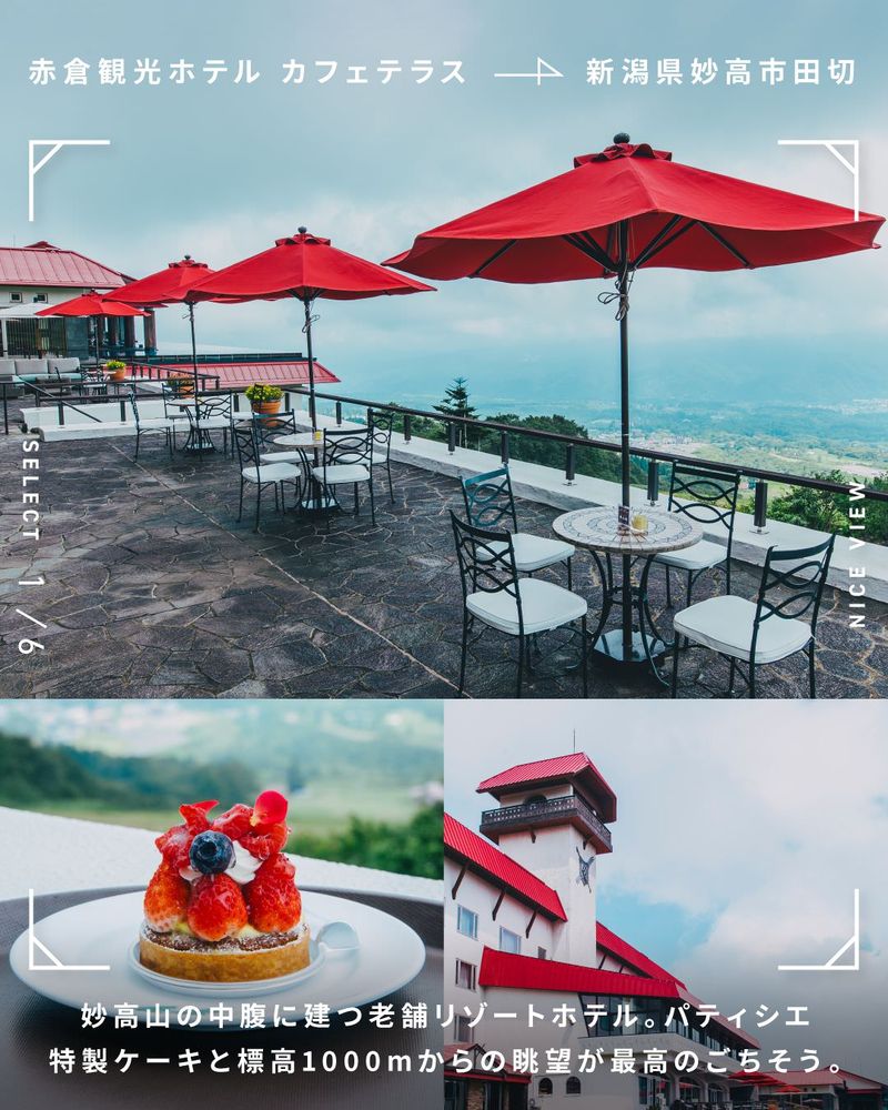 妙高山の中腹に建つ老舗リゾートホテル。パティシエ特製ケーキと標高1000mからの眺望が最高のごちそう。