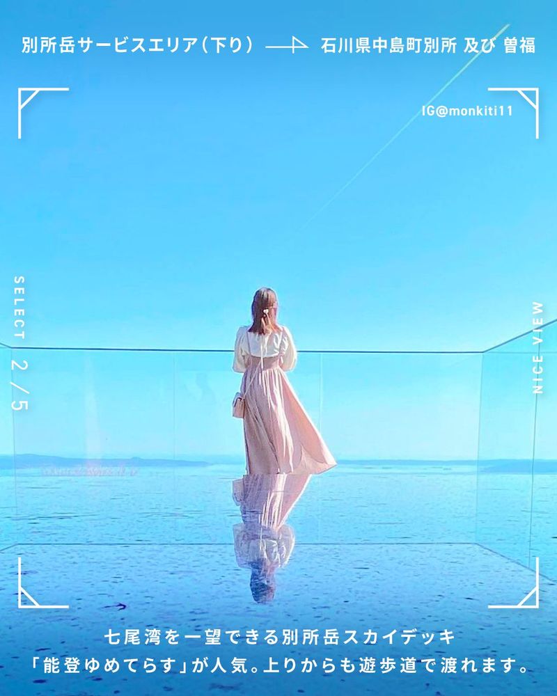 七尾湾を一望できる別所岳スカイデッキ「能登ゆめてらす」が人気。上りからも遊歩道で渡れます。