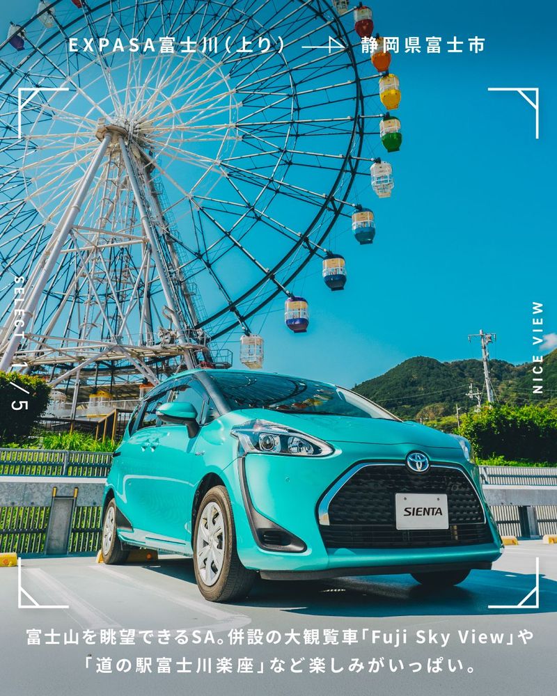 富士山を眺望できるSA。併設の大観覧車「Fuji Sky View」や「道の駅富士川楽座」など楽しみがいっぱい。