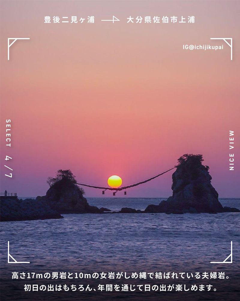 高さ17mの男岩と10mの女岩がしめ縄で結ばれている夫婦岩。初日の出はもちろん、年間を通じて日の出が楽しめます。