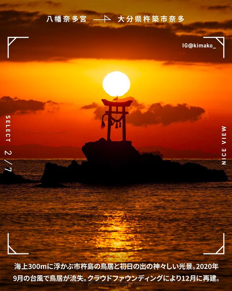 海上300mに浮かぶ市杵島の鳥居と初日の出の神々しい光景。2020年9月の台風で鳥居が流失。クラウドファウンディングにより12月に再建。