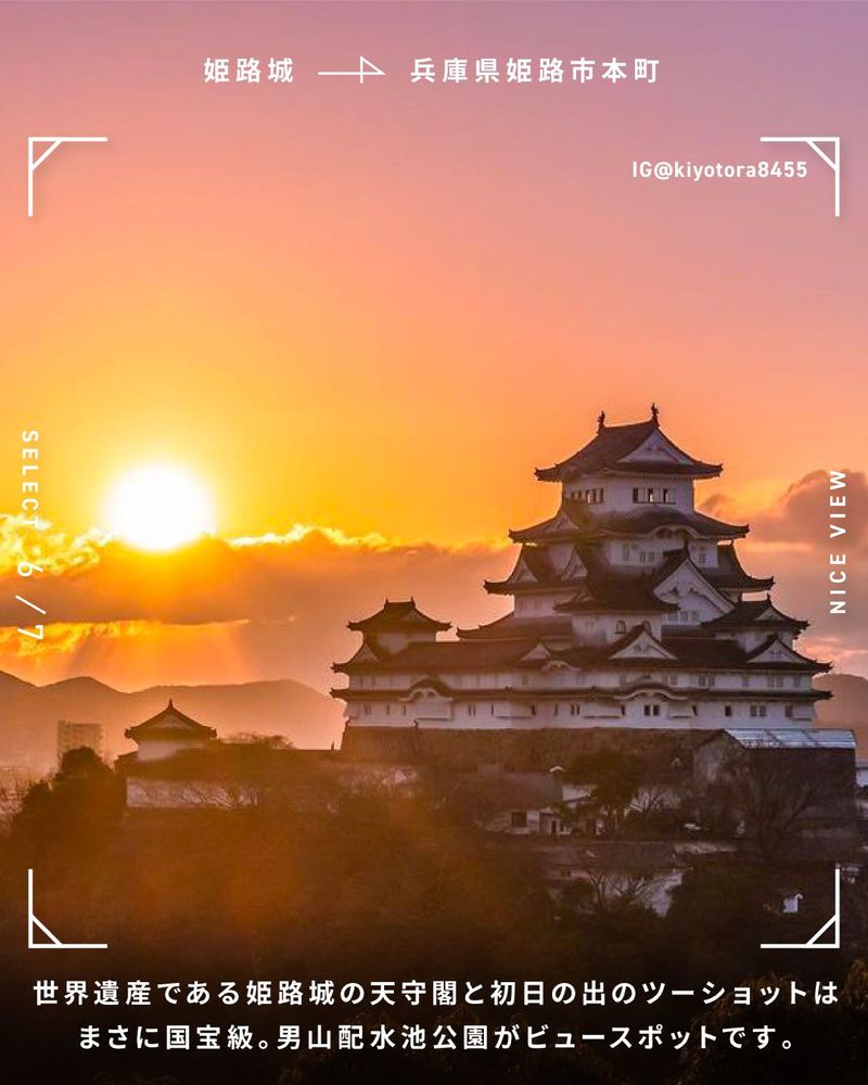 世界遺産である姫路城の天守閣と初日の出のツーショットはまさに国宝級。男山配水池公園がビュースポットです。